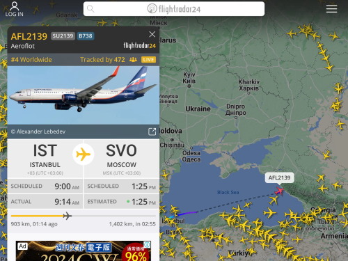 先日フライトレーダー24を見ていると,エアロフロートの航空機が一枚目写真のようにウクライナ上空を飛んでいた。