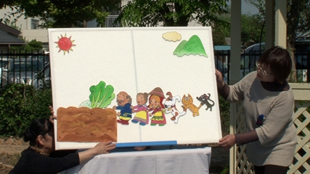 パネルシアターや紙芝居、手遊びに絵本の朗読などもりだくさんな内容でした。