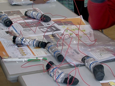また、炭を使った電池づくりでは、食塩水で濡らしたキッチンペーパーとアルミホイルを巻いた炭で麦電球に電気をつけたりプロペラを回したりしました。