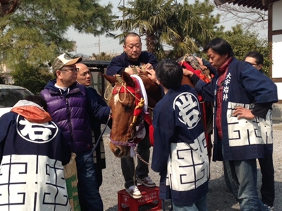 10時すぎに祭馬が到着すると、鞍や装飾具をつけ、たてがみを結います