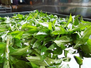 サークルの方が持ち寄ったタデアイの葉と資料館の庭で育てているタデアイをみんなで摘んで使いました