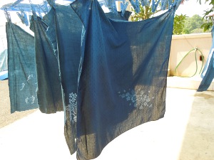 乾燥したらおが屑を落として藍甕につけてあとは陰干しすると